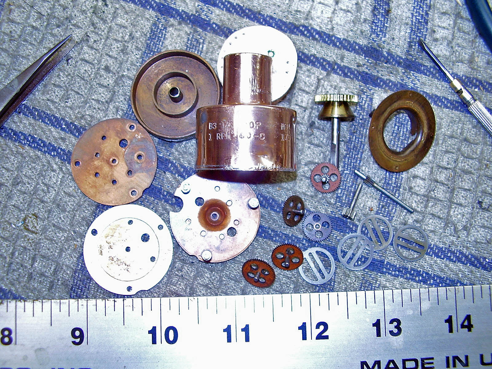 Back to Mike's Clock Clinic's Main Web PageThe Telechron M-31 was the mainstay "B-3" rotor that was used in nearly all of the chiming G.E., Herschede, Revere, and Telechron mantle and tall case clocks for all of the 1930's and into the 1960's. The next most popular rotor was the "B-3" M-2377. It is identical to the M-31 except it was manufactured for a specific Telechron customer. The Telechron rotor must be opened in the same way it was sealed at the factory. This way the rotor stays its original size. Other "repair people" will cut the rotor open and that will lead to a shorting of the rotor and will weaken the side walls of the rotor. All wheels are checked for looseness on their individual shafts. This check is vital and must be done for each wheel. Both top and bottom plates are cleaned and then checked for worn and oversized bearings. Each bearing must be the correct size or there will be a power loss. Here's a few of the pictures at various steps in the process. The rotor is now open and here's what we find inside on the top plate.